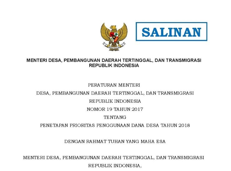 Permendes Nomor 19 Tahun 2017 tentang Prioritas Penggunaan Dana Desa Tahun 2018